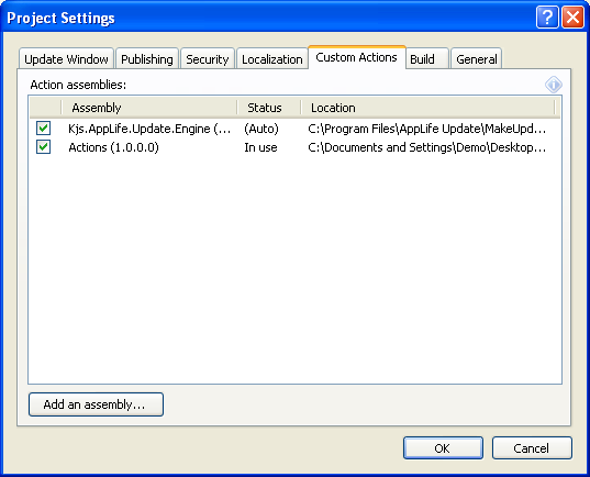 Note: AppLife Make Update loads the custom action assemblies that are used by the project. When a custom action assembly is loaded, the assembly is locked by Make Update. This could cause Visual Studio builds to fail if you reference your custom action assemblies in Make Update from the Visual Studio build location. To unload the assemblies you will need to close AppLife Make Update.