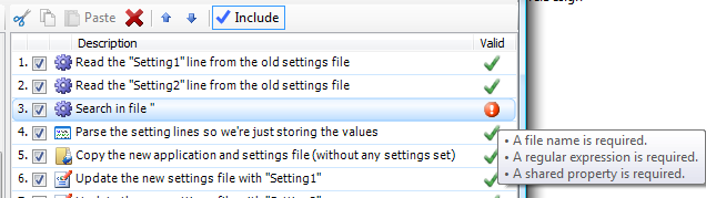 This action will search the OldSettingsFile.txt file for the line that has the Setting1=value, and if found, the entire line will be placed in a Shared Property named Setting1.